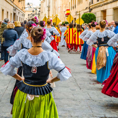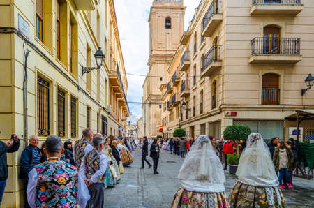 VALENCIA,SPAIN - MARCH 18: Several unidentified women walk in the offering of Fallas, one of the biggest parties in Spain on March 18,2016 in Valencia,Spain.