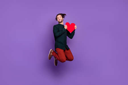 Photo of handsome funky young guy dressed smart casual clothes jumping high holding large red heart smiling isolated violet color background