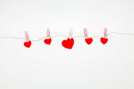 Red hearts with clothespins hanging on clothesline isolated on white background. Valentine's Day