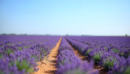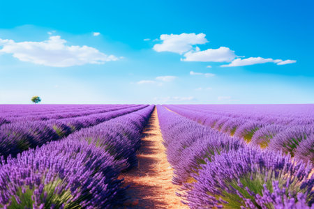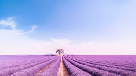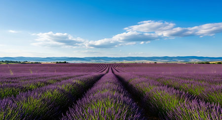 AI Generated. Vast lavender field under a bright sky creating a tranquil landscape view