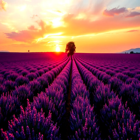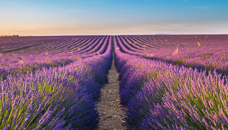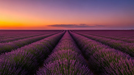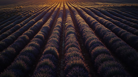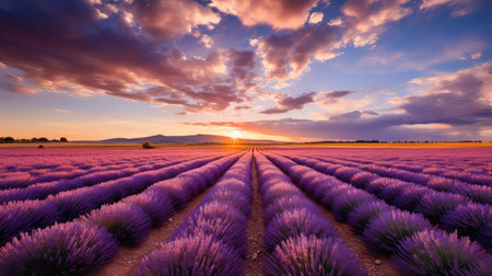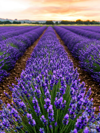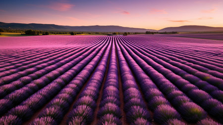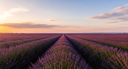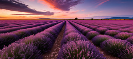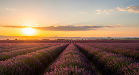 Expansive lavender field glows under the warm light of a beautiful sunset, showcasing perfectly aligned rows leading to the horizon