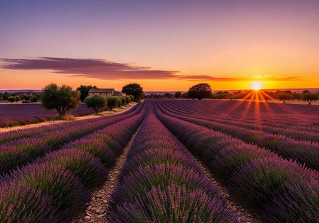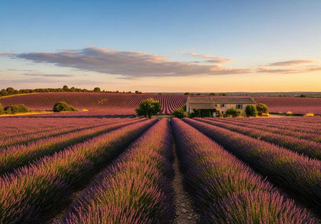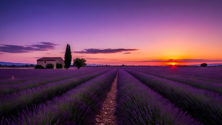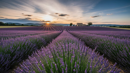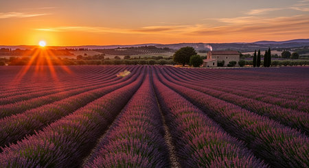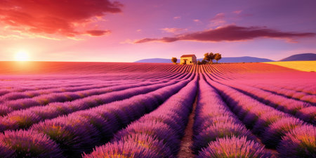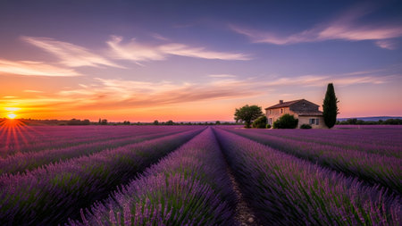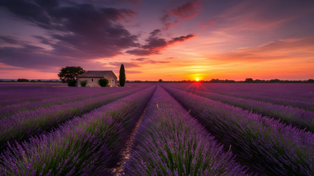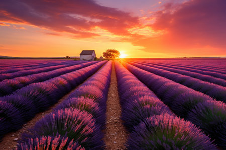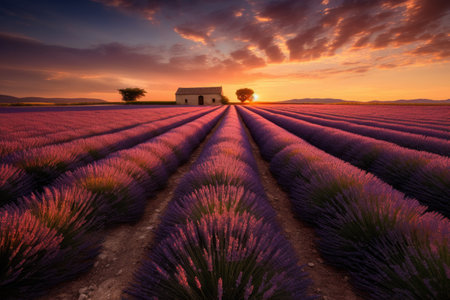 Beautiful sunset over a traditional house nestled amidst vast lavender fields in provence