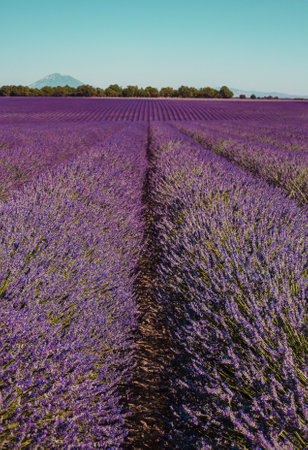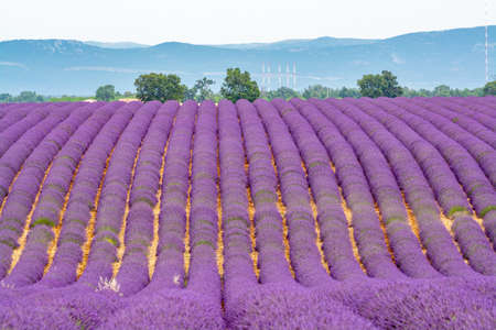 Landscape with blooming lavender fields and mountains in the distance, France. Flowering season. Attraction trip for french vacation.