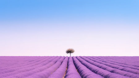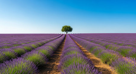 A vibrant lavender field stretches to the horizon, punctuated by a single tree under a clear blue sky in Provence, France.