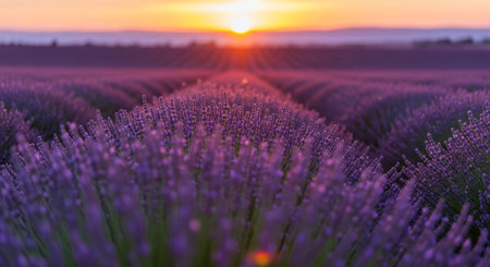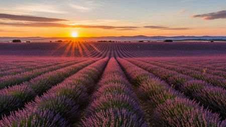A serene landscape featuring a vast field of lavender in full bloom, with rows of purple flowers stretching towards the horizon. The scene is set against a breathtaking sunset, with the sun casting a warm orange glow over the field and the sky transitioning into hues of blue and orange. The atmosphere is peaceful and idyllic, capturing the beauty of nature.