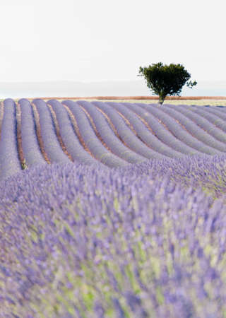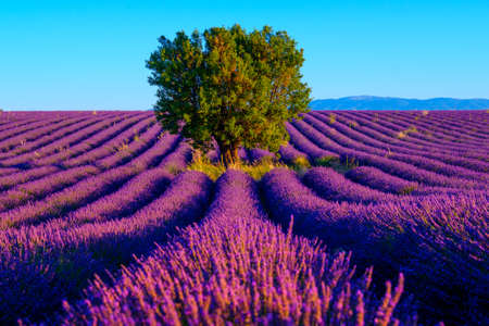Lavender field at plateau Valensole, Provence, France. Focus to the tree