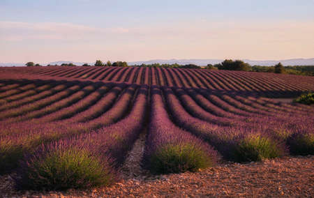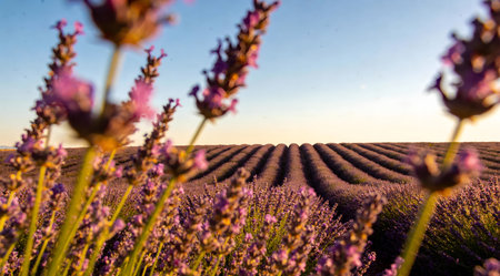Countryside showing endless rows of blooming purple lavender fields stretch towards the horizon at sunset in provence france keywords: lavender...