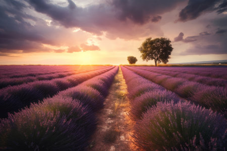 A picturesque lavender field in provence bathed in the warm glow of a vibrant sunset