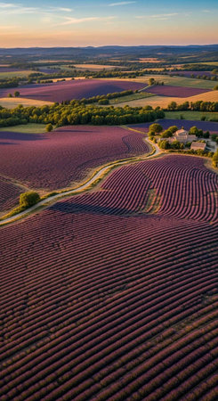 Endless rows of purple lavender under golden sunset, rolling hills, French countryside.