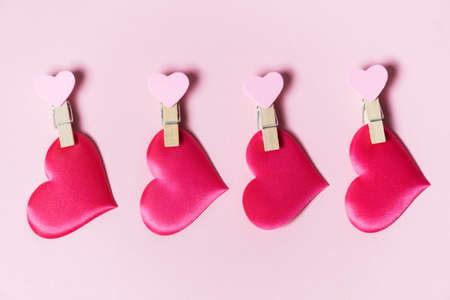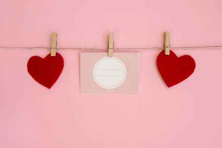Paper sheets on thread with heart shaped clothespin on rose background. Happy Valentine's day, mother's day.