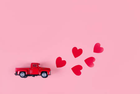 Gift box and retro car with paper hearts on a pink background. Valentine's day concept, anniversary, mother's day and happy birthday greeting, copyspace, close up
