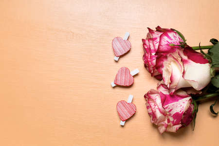 Valentine`s Day holiday card frame with heart-shaped pins and bright pink roses, top view