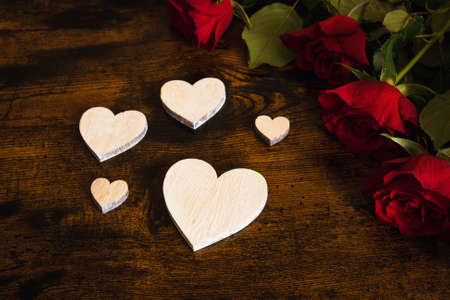 red rose bouquet on wooden table with hearts