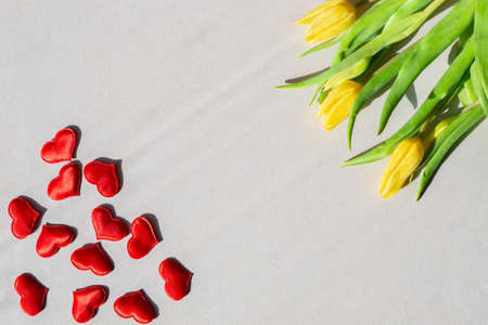 Yellow tulips and red hearts on a gray background, flat lay. Template for congratulations on Womens Day, Birthday and Valentines Day. Copy space.
