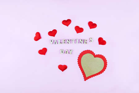 card for valentine's day. on a pink background wooden letters lined with love. funny congratulations. Flat lay, top view. red shiny hearts.