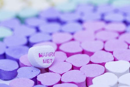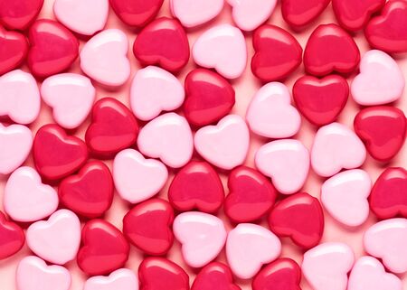 Close-up view of many small, colorful heart-shaped candies. A vibrant and romantic image perfect for Valentine's Day.
