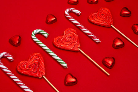 Valentines day with candy hearts over red background with copy space. Top view flat lay