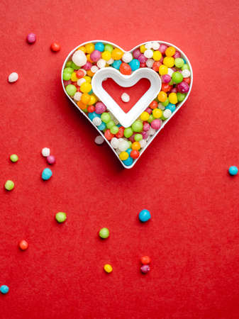 Red background with multicolored heart rests in the concept of Valentine's Day. Candy hearts on a red background in vintage style. Copy space on red background and heart.