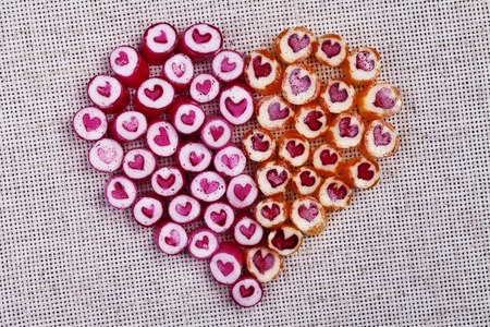 heart candies in the shape of a heart on a red textured background focus on front candies