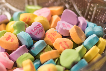 Extreme close-up of tiny candy hearts in red, pink and white for Valentine's Day