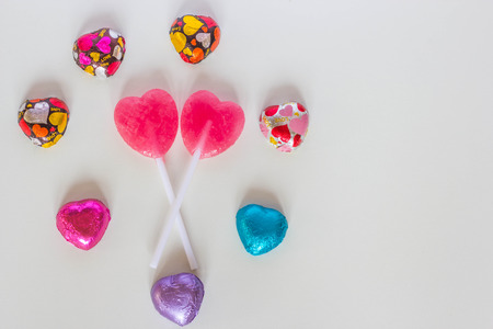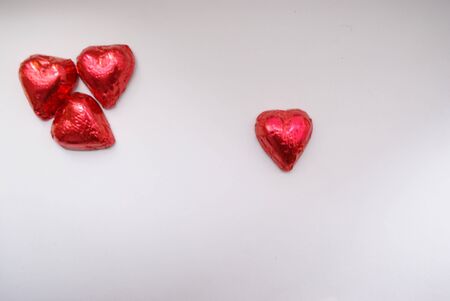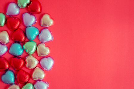 Red and pink foil wrapped heart shaped chocolates scattered across right side of white background