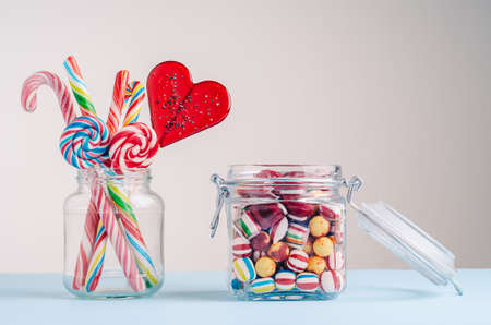 A lot of small candy in form of hearts in open glass jar on light background. Concept of sweet love.