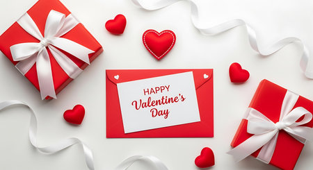 A festive valentine's day arrangement featuring gift boxes, hearts, and ribbons on a clean white surface, perfect for vlt1 inspiration.