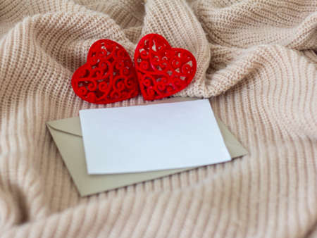 Two red hearts made of cardboard, a white envelope and a message with a painted heart. Attributes of Valentine's day, on a light background.
