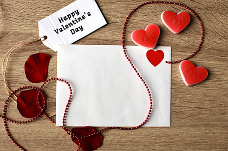 Mockup postcard and envelope on grunge white wood background with Happy valentines day, handy craft and red gift bow. Mock up for elegant design. Flat lay top view valentine's day background.