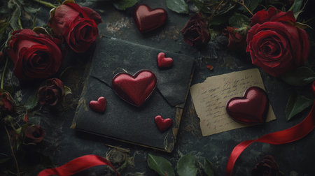 A captivating arrangement featuring deep red roses and heart-shaped decorations on a dark surface, perfect for conveying romantic themes and emotions.