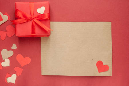 gift box and empty brown paper on red background