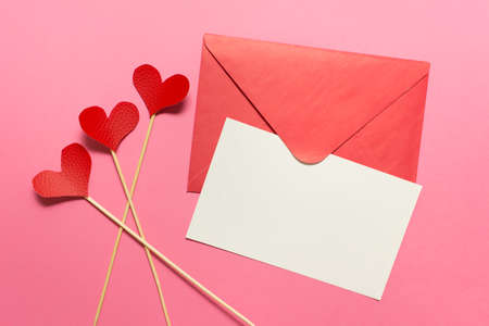 A flat lay arrangement features a red envelope, blank card, and scattered decorative hearts on a vibrant red background. This setup is perfect for love notes or special messages.