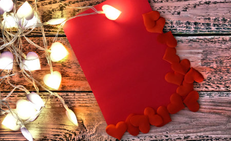 Partial Blurred Glowing garland and red empty card, space for text. Rustic style. Blank for banner or card for Valentine's Day or Wedding