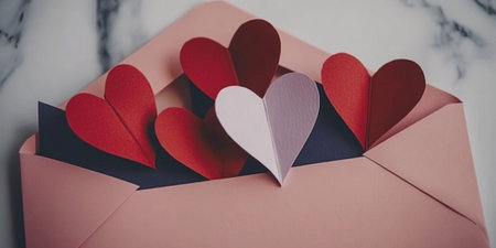 Vibrant red hearts surround a blank card on a dark textured surface