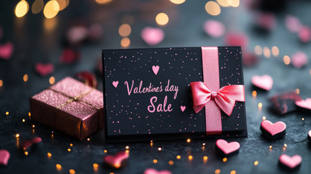 Valentine s Day Sale Greeting Card Romantic Black Card, Gift, and Sparkling Hearts Bokeh
