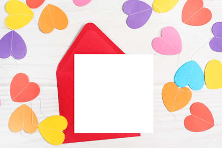 Blank greeting card or invitation. Valentines day card mockup with paper hearts on red background