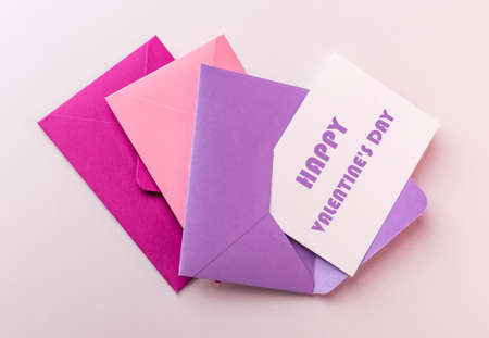 Card with happy Valentines day greeting in envelope. Envelopes on pink background. High quality photo