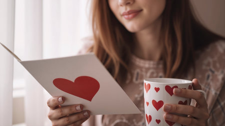 A young woman with auburn hair smiles gently as she reads a Valentine's Day card adorned with a large red heart, while holding a mug decorated with smaller red hearts, Generative AI.