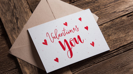 Valentine's day greeting card with envelope on wooden background.