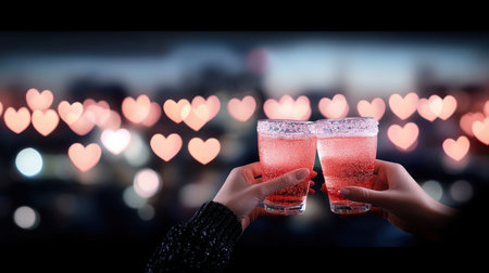 Close-up of two hands holding glasses of pink cocktails, clinking them together in a toast. The focus is on the drinks and the act of toasting, with a soft, romantic background.