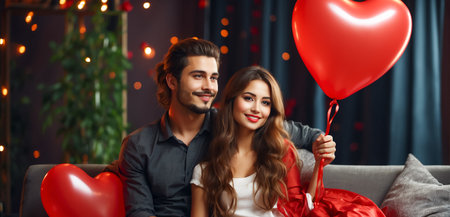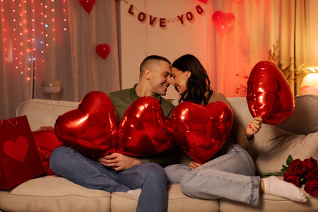 Loving couple bonding, sitting on couch holding red heart-shaped balloons, touching foreheads and smiling, room filled with heart decorations. Valentines day concept