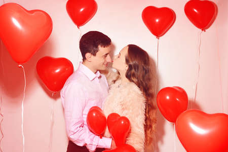 Man with his lovely sweetheart girl kiss at Lover's valentine day. Valentine Couple. Couple kiss and hug. On background red balloons hearts. Love concept