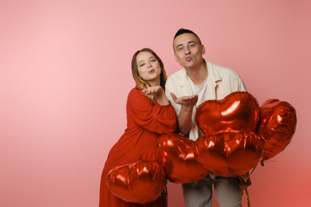 A girl in a red dress with a guy on a pink background are holding red balloons in the shape of a heart and blowing air kisses to the camera. Place for text or product