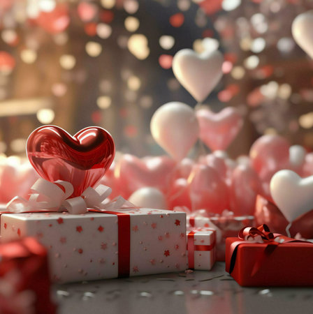 Intimate valentine's scene with shimmering red hearts, wrapped gifts with bows, glowing candle and two glasses of red wine on a cozy wooden table for a romantic celebration