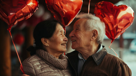 Happy senior couple with heart shaped balloons at Valentine's Day, Asian