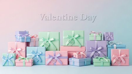 A variety of gift boxes in pastel shades of pink, blue, green, and purple, adorned with ribbons and heart-shaped ornaments, arranged on a soft...