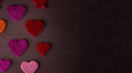 Valentines day concept banner with sparkling glitter hearts against abstract grey background and the bokeh of garland with space for text.