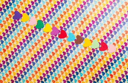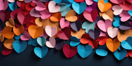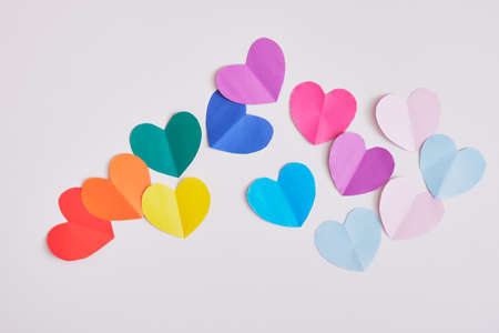 Many multi-colored paper hearts, top view. Valentine's day theme.