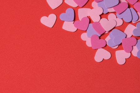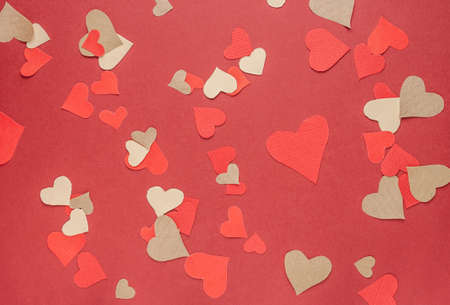 Beautiful festive background with red metallic heart shaped confetti. Valentines day background. Copy space for your text. Selective focus.