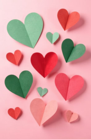Red and green paper hearts forming a romantic pattern, ideal for valentine's day projects